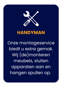 Demontage en Montage Wij kunnen u helpen met het demonteren en monteren van meubels en apparatuur. Dit bespaart u tijd en moeite tijdens uw verhuizing.